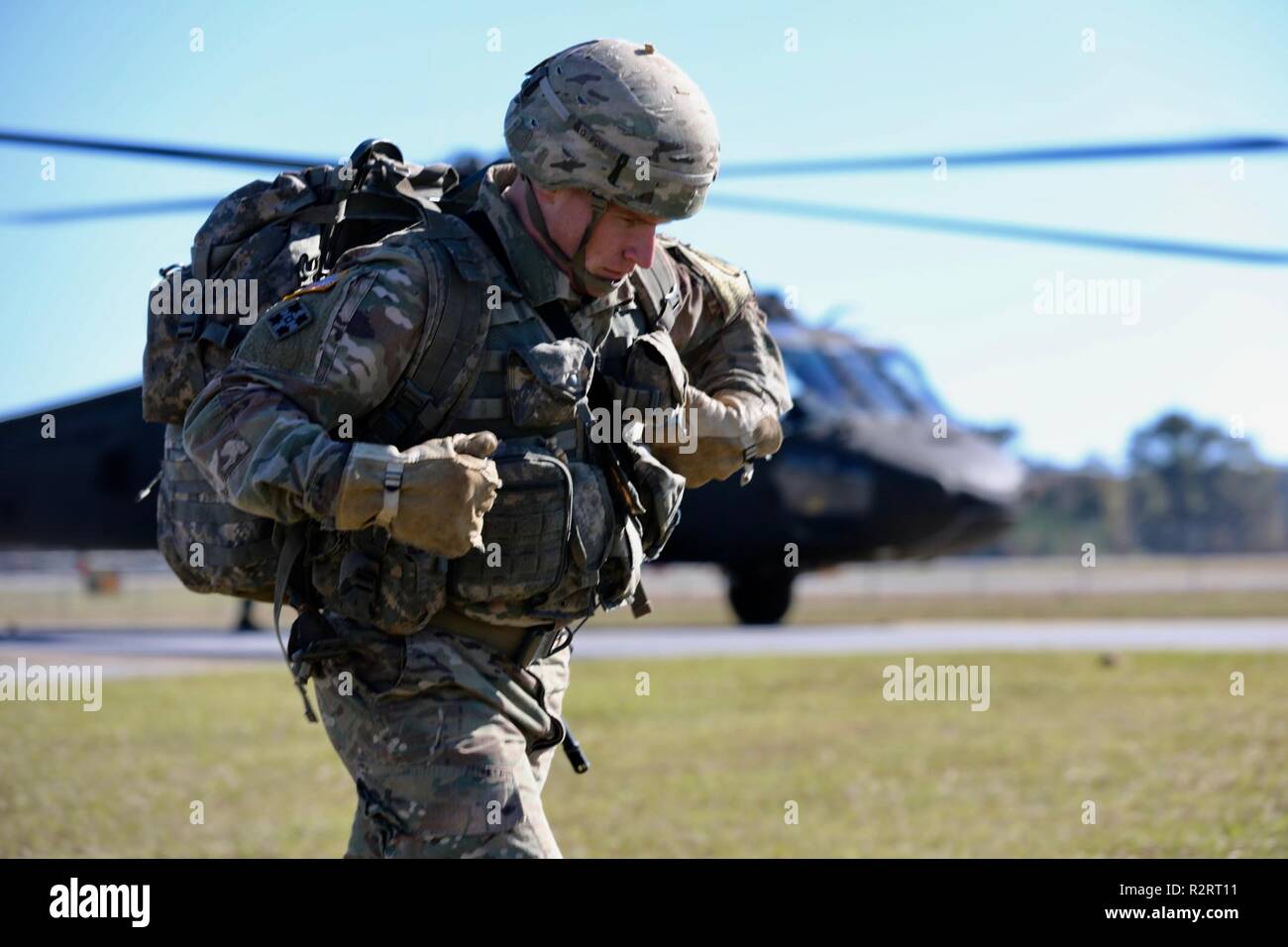 U S Army Sgt 1st Class Joel Kreusel Assigned To The 5th Ranger Training Battalion Runs Off The Landing Zone After Completing A Fast Rope Insertion Extraction Fries During Fries Spies Training At The Army