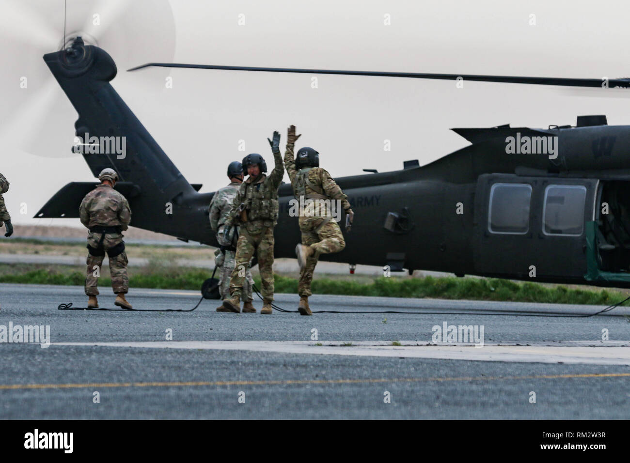U S Army Soldiers High Five Between Iterations During Fast Rope Insertion And Extraction System Training At The Udairi Landing Zone Camp Buehring Kuwait Feb 9 2019 The Crew Members Assigned To The